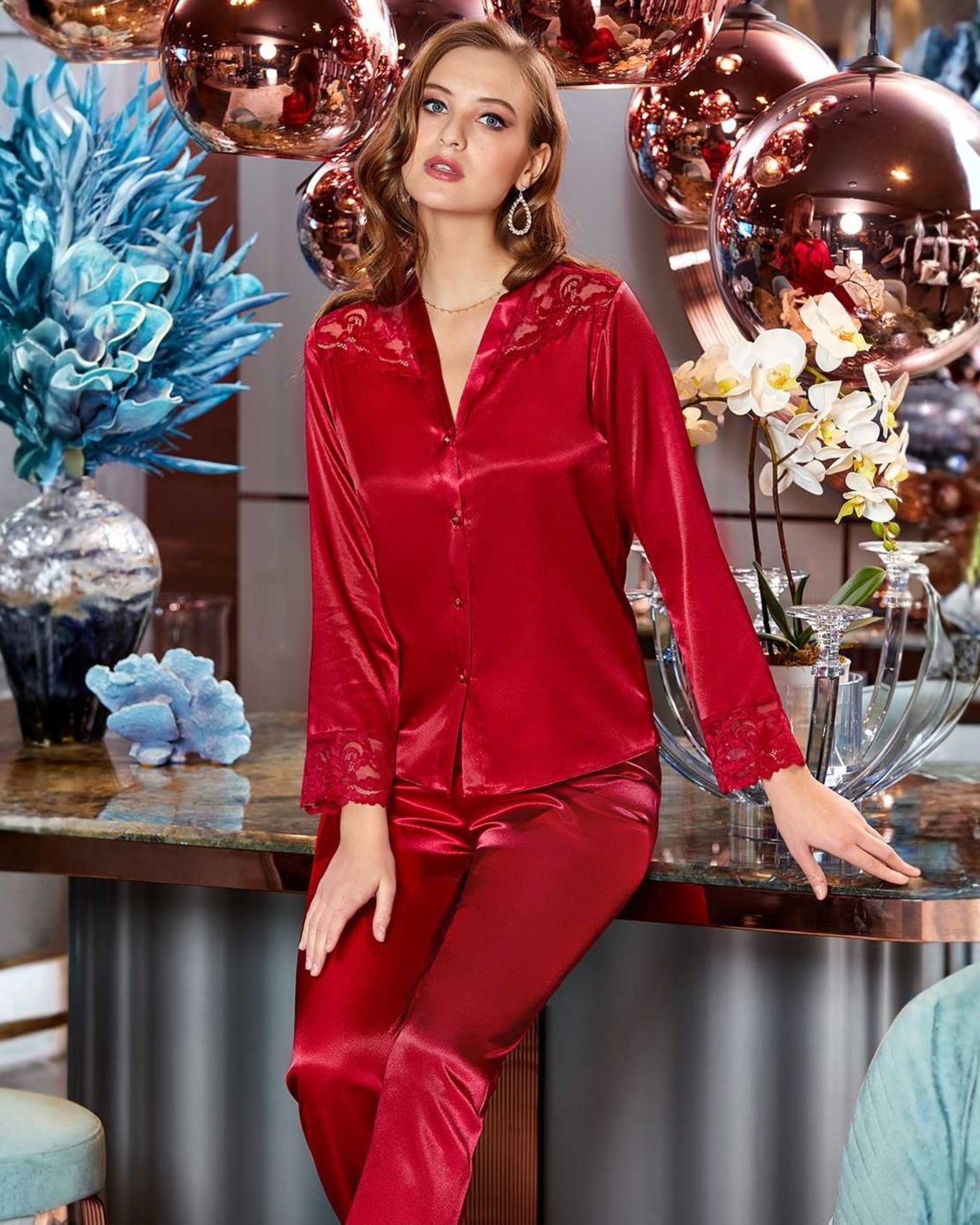 Uzun kollu saten pijama takımı (üst + pantolon)